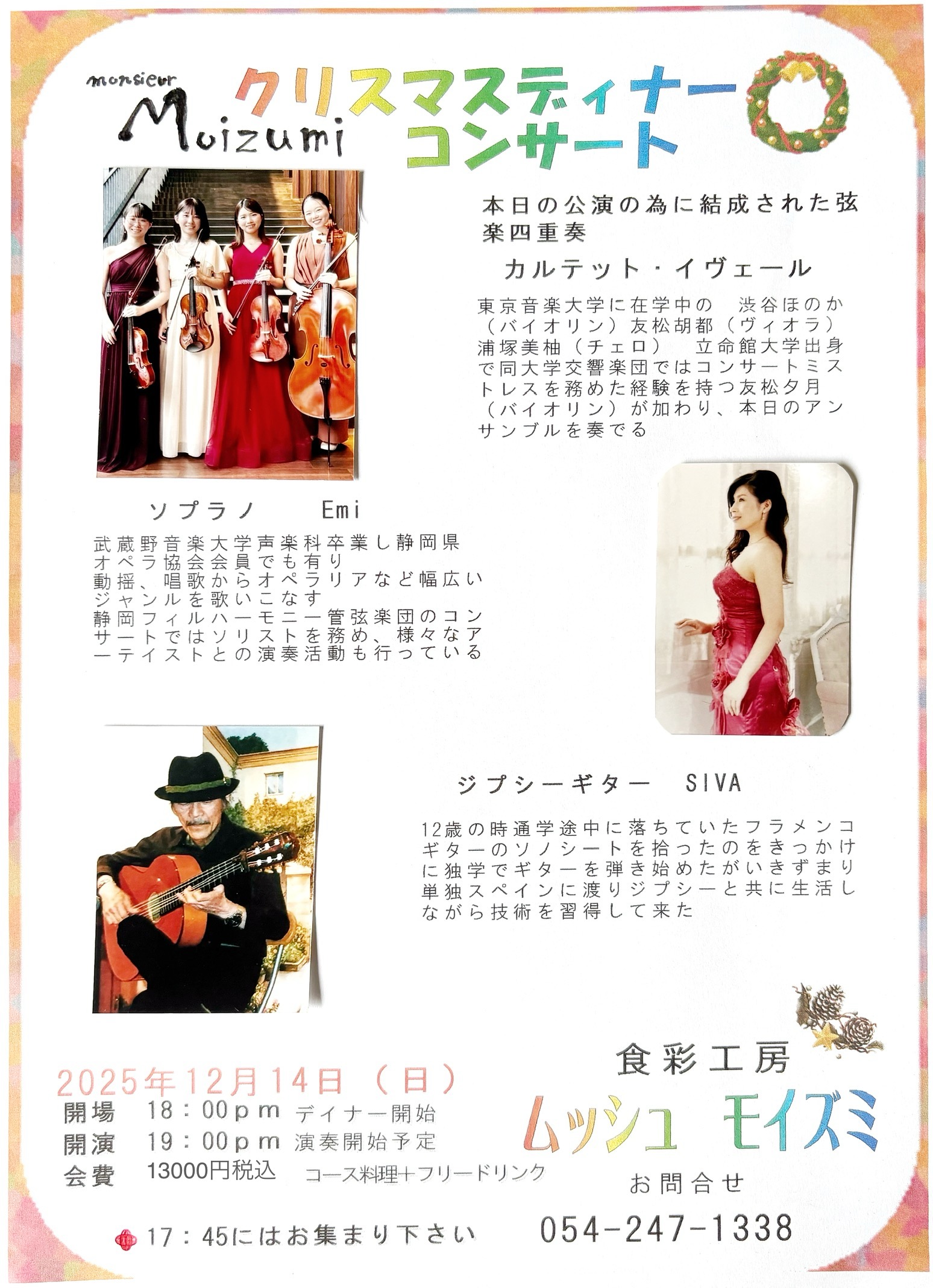 ひと足早いクリスマスディナーコンサートで、楽しみませんか?皆様とモイズミのために結成された「カルテット イウ”ェ‐ル」の弦の重なりあう奥深い音色。ソプラノ歌手「Emi」さんの透き通った声。静岡のプシーギターの大巨匠「SIVA」さんの情熱が厚く伝わるギターテクニック。そしてモイズミの美味しいコース料理で、来場の方々に楽しんでいただける、プランをご用意して皆様からのご連絡をお待ちいたします。定員23名と少数ですのでお早目のご連絡を。
